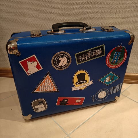 Lasten muumiaiheinen, lähes vintage-vetolaukku parinkymmenen vuoden takaa. Korkeus 44 cm, leveys 28 cm. Hyvä käytetty kunto, sisäkuminauhojen napakkuus hieman löystynyt. Laukku on koirakodissa. Toridiili tai nouto Helsingin Toukolasta.