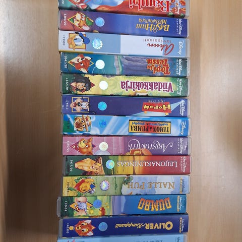 Sekalainen kokoelma VHS-elokuvakasetteja. Kuvat esittävät useita eri elokuvia eri genreistä, kuten toiminta, komedia, kauhu ja draama. Kasetit ovat standardikokoisia VHS-videokasetteja koteloineen. Sopivat VHS-soittimella katsottavaksi tai kokoelmakäyttöön. Myydään myös erikseen 1,-/kpl