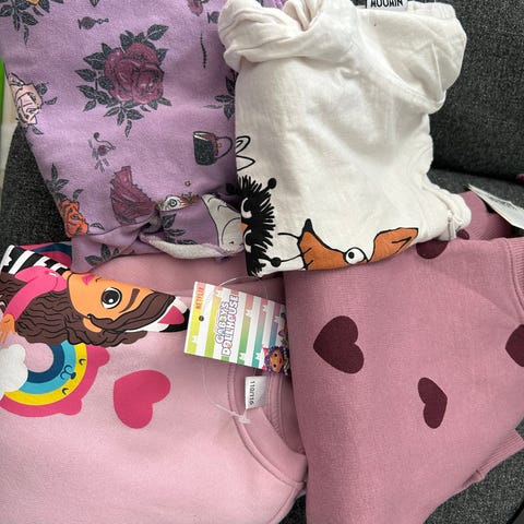 Vaatesetti lapselle itse tehtyjä uniikkeja vaatteita, 14 vaatekappaletta yhteensä