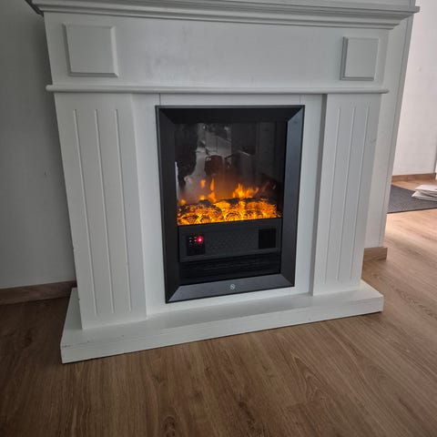Valkoinen sähkötakka mustalla etupaneelilla. Takassa on suorakulmainen kehys ja yksinkertainen, klassistyylinen jalusta ja ylälevy. Pientä kulumaa pinnoissa, kuten kuvissa näkyy, mutta muuten aivan toimiva eikä muuta vikaa ole. Sen saa kytkettyä sähköön ja pienestä luukusta löytyy virtakytkimet, josta voi valita haluaako pelkästään valo-ominaisuuden, vai että se puhaltaa myös. Mitat: 109 cm leveä ja 100 cm korkea.