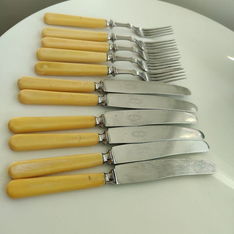 Hackman Sorsakoski luupääaterimet. Haarukoita 8 kpl, veitsiä 9 kpl. Kunto erinomainen. Alkuperäiset Hackman Sorsakoski -leimat. Huomioi, että yksi veitsistä on muita pitempi ja yhden terän muoto poikkeaa muista. Haarukoiden pituus 18,5 cm, veitsien pituus 20,5 – 22 cm.