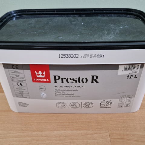 Tikkurila Presto LF tasoite. Valkoinen valmis tasoite sisäseinien ja -kattojen tasoitukseen. Soveltuu esimerkiksi kipsi- ja betonipinnoille ennen maalausta tai tapetointia. 3 litraa.