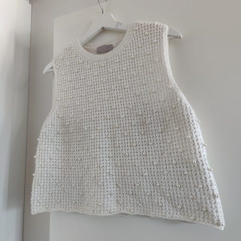 Vaalea hihaton toppi, kerran käytetty. 53% villaa, 23% polyamidi, 22% mohair, 2% elastaani.