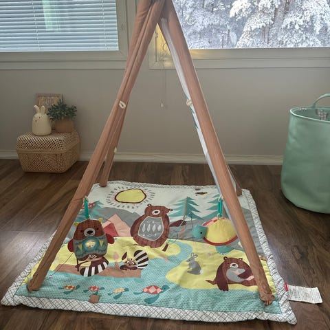 Myydään Beemoo Camping Vibe Activity Gym leikkimatto, jonka voi koota kolmella tavalla: tunneli/katos, tiipii sekä perinteinen leikkimatto. Itse matto on pesty hajusteettomalla pesuaineella. Tukikaaret on pyyhitty kostealla liinalla. Siisti näin, mutta pientä käytönjälkeä voi näkyä. Mukaan tulevat lelut (4 kpl) ovat jo kuluneita, eli niissä näkyy naarmuja ja soittorasia-lintu ei enää soi. Ripustuslenkit saa irti leluista, joten meillä tähän on ripusteltu myös muita leluja. Koiratalous.