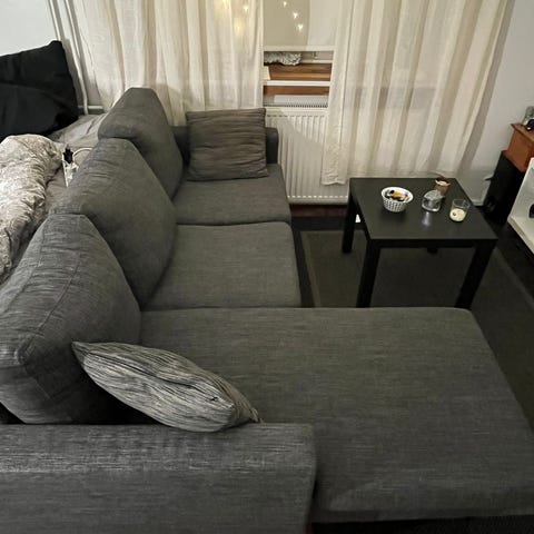 Muuton tieltä kiireesti pois divaanisohva. Käytön jälkeä löytyy ja vaatii pesua mutta itse emme kerkee enää pesemään.