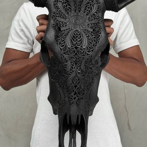 Ei varaushintaa - upea suuri ruskea veistetty härän pääkallo - kukka-aiheine