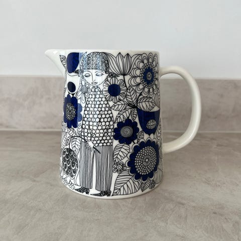 Arabia Pastoraali kannu sinivalkoinen keramiikka. Kannussa on Pastoraali-kuviointi, jossa on sinisiä ja mustia kukka- ja hahmoaiheita valkoisella pohjalla. Valmistajan merkintöjen mukaan kannu kestää konepesun, mikroaaltouunin ja uunin. Soveltuu esimerkiksi maidon, veden tai muiden juomien tarjoiluun sekä sisustuselementiksi.
