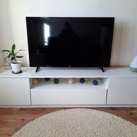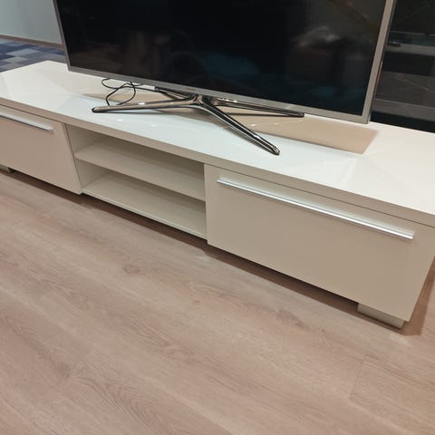 Korkeakiiltoinen TV-taso. Kaksi vetolaatikkoa, toimii hyvin. Käytönjälkiä kuitenkin löytyy.