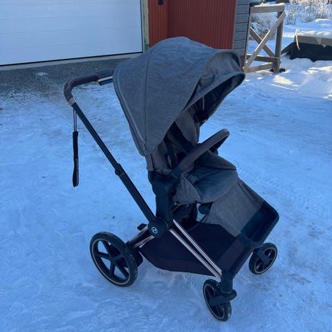 Mukaan myös lisävarusteina ostetut isot eturenkaat ja Cybexin hoitolaukku.