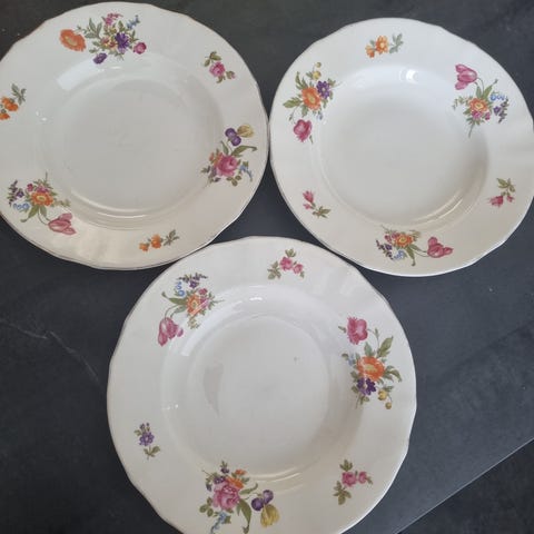 Arabia lautaset, joissa monivärinen kukkakuviointi vaalealla pohjalla. Lautasissa on kevyesti aaltoileva reuna ja kultaus reunassa. Sopivat esimerkiksi kattaukseen ruokalautasina tai tarjoiluun.
