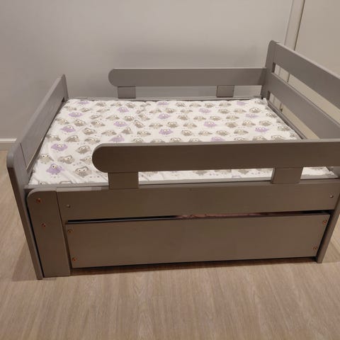Sopii hyvin ensimmäiseksi omaksi sängyksi pinnasängyn jälkeen. Sivupaneelit estävät lasta tippumasta sängystä.