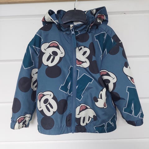 Mickey Mouse lasten takki, koko 92. Sininen kuoritakki, jossa kauttaaltaan Mikki Hiiri -kuviointi. Edessä vetoketju ja huppu, jossa korvat. Sisäpuolella pehmeä fleecevuori ja hihoissa kevyt vanutäyte.