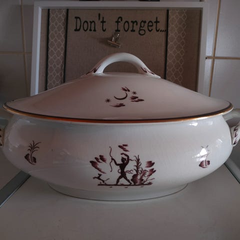Myydään upea Arabia Diana -sarjan vintage-kannusetti keramiikkaa, joissa ruskea peura-aihe, kultareunukset, simpukkamainen kannennuppi ja perinteinen piippuleima pohjassa. Tuotetta valmistettiin vuosina n. 1929-49.