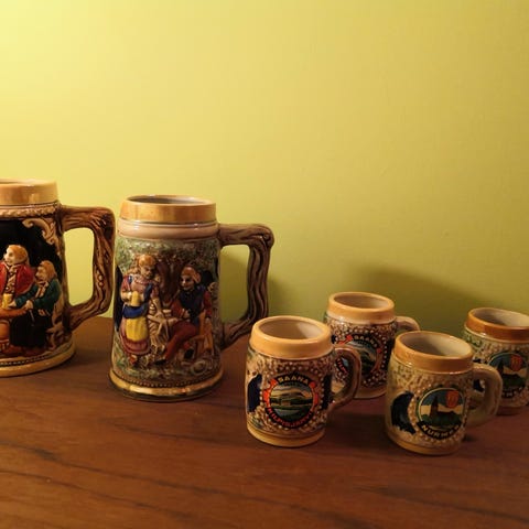 Todella tunnelmalliset 60–70-lukuhenkiset tuopit, koristeellisilla vaaleilla vyöhykkeillä. Toisessa isommassa tuopissa pieni lohkeama reunassa (kuva lisätty), muuten siistit ja ehjät. Snapsilasi ehjä.