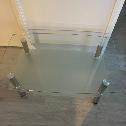 Myydään muuton tieltä sohvapöytä, jossa valkoiset puiset reunat ja jalat sekä lasinen kansi.