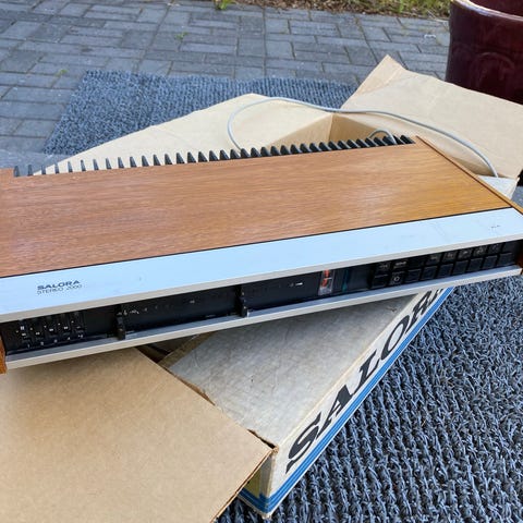 Salora HIFI Stereo 1700 -viritinvahvistin, jossa on sisäänrakennettu kasettisoitin.