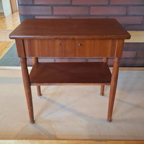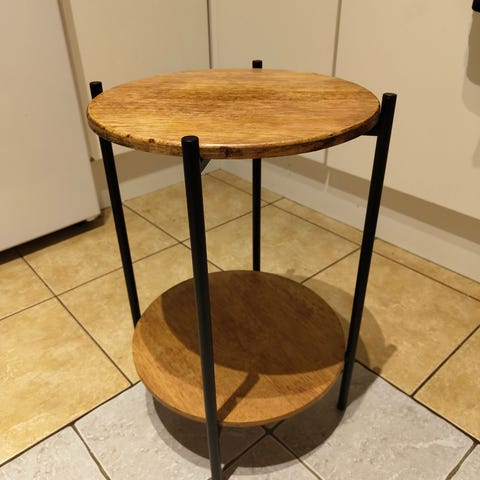 Puusta tehty taso kasville tai lampulle esimerkiksi, lämpimän puun sävy.