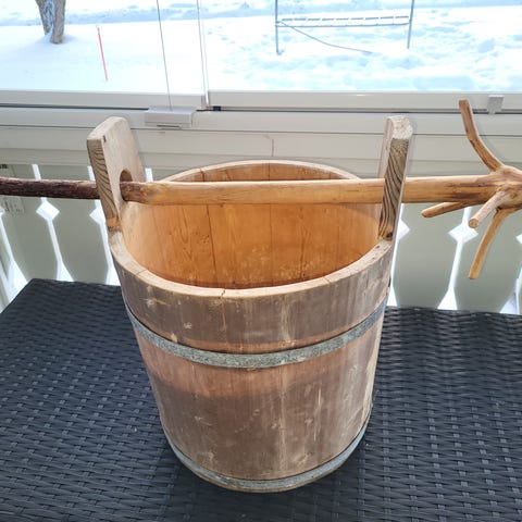 Vanha taikinatiinu. Mukaan sekoitin. Nouto Imatralta tai toimitus omien menojen mukaan Imatra -LPR alueelle. Korkeus 44 cm ( kahvaan asti)