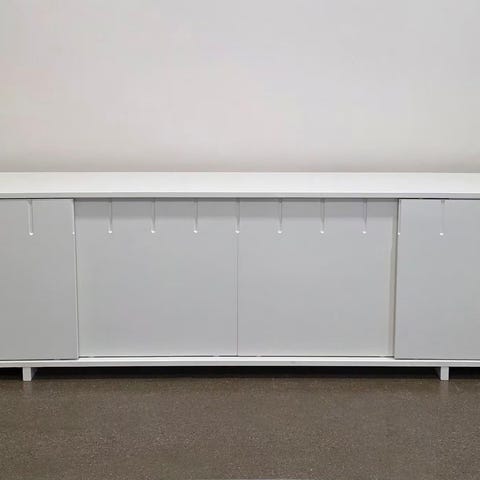 Todella raskasta tekoa ( paino +50 kg) oleva TV-taso. Ylä ja alataso 38 mm vahvaa tod.näk. liimapuumassiivilevyä. Muu runko 20 mm lastulevyä. Laatikoiden ja hyllyjen paikat vaihdettavissa helposti - toisen hyllylevyn pinnit kateissa. Vas. ja oikea puolen takaseinissä valmiit reiät piuhoja varten. Yläkannessa muutama käytön jälki. Purettavissa kuljetusta varten..