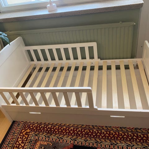 Jollyroom juniorisänky. Valkoinen lasten sänky, jossa matalat laidat. Sopii taaperolle tai leikki-ikäiselle lapselle siirtymävaiheen sängyksi pinnasängyn jälkeen. Kuvissa näkyy sänkyyn sopiva peitto, joka havainnollistaa nukkumapaikan kokoa.