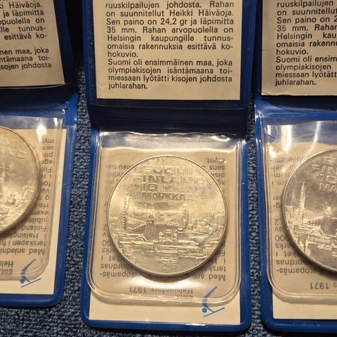 Kuvanmukaisia hopea 50 mk juhlarahoja 5 kpl hinta yhteensä 120e