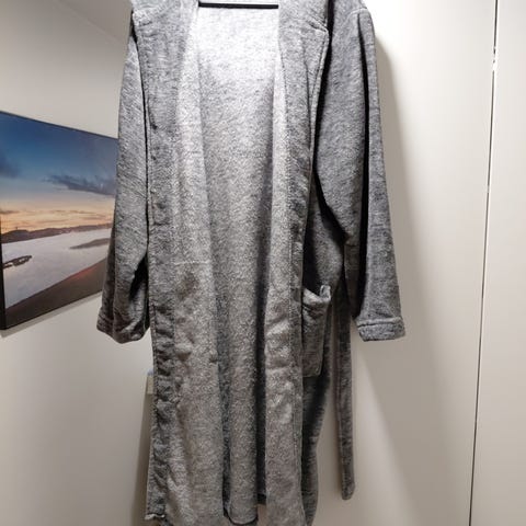 85 leveys, 140 pituus. Molemmat puolet yhtä pitkät. Etupuolella kaunis vastakuviointi, huppu ja vyö. Aivan uusi. Ompelijalla teetetty.