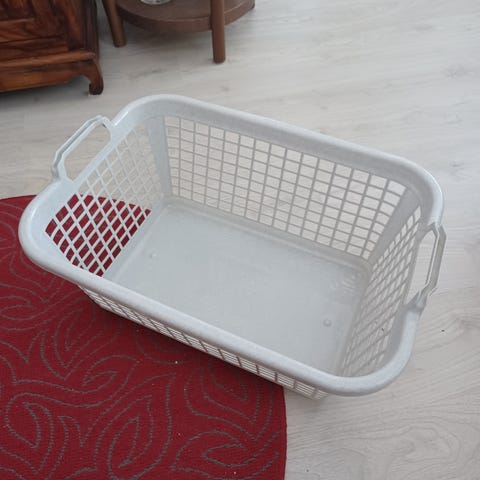Ehjä säilytyskori. Ei pysyy enää muodossa, ja siitä irtoaa loputtomasti valkoista pölyä.
