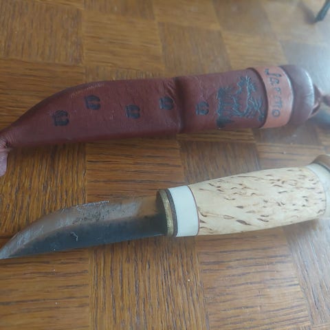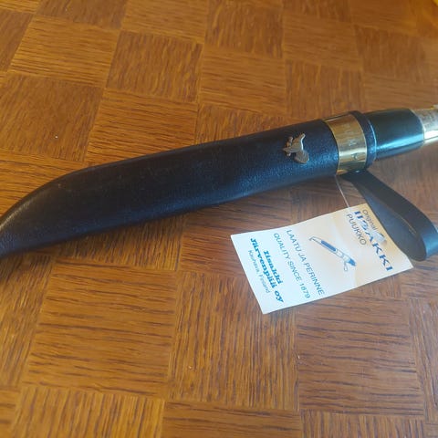 Terä hiiliterästä, pituus 20 cm. Käyttämätön. Nahkatuppi.