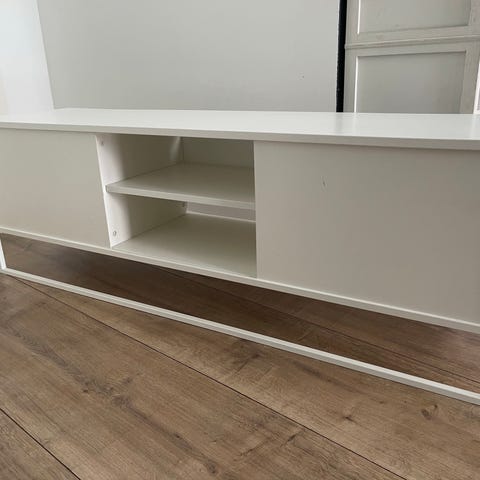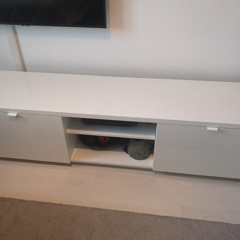IKEA Fjällbo tv-taso, jossa musta metallirunko ja ovet verkkolevyä. Tasossa on puunvärinen kansilevy.