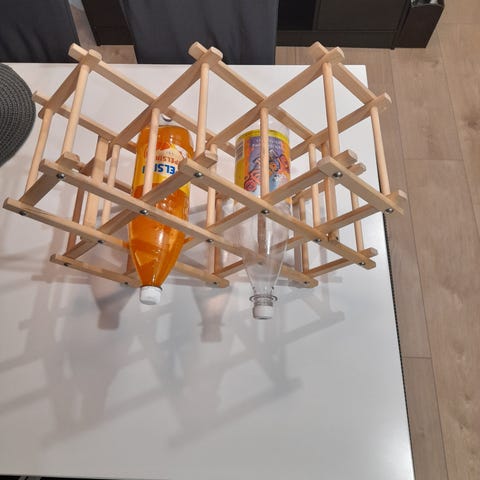 Käsittääkseni kotimaista käsityötä, jostain pohjois-Suomesta. Ei valtavan monia tehty. Kaunis pulloteline hienoine yksityiskohtineen kaipaa arvostavaa uutta kotia!