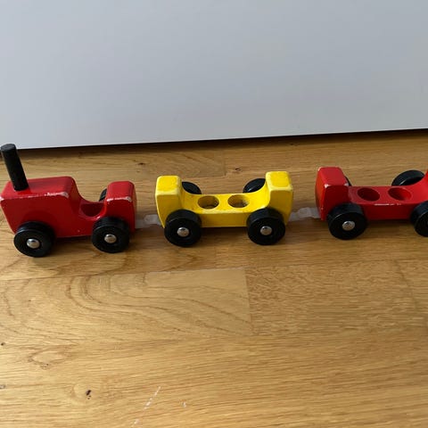 Puinen Juho Jussila Oy:n retro-juna, jossa tavaravaunu, jonka ovet aukeaa sekä matkustaja vaunu. Pituus n. 97 cm. Kolhua ja kulumaa (kuvissa), mutta toimii yhä leikkeihin seuraaville. Matkustaja vaunu katto irtoaa.
