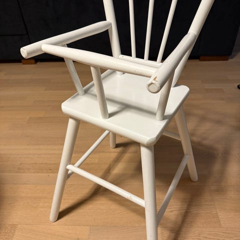 Sopii lapsen ruokailuun ja leikkihetkiin sopiva jämäkkä syöttötuoli. Materiaalina vaalea puu.