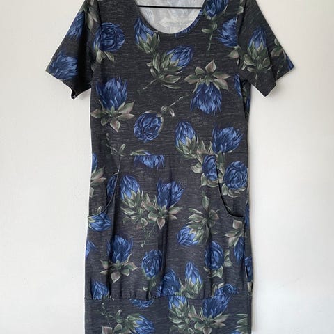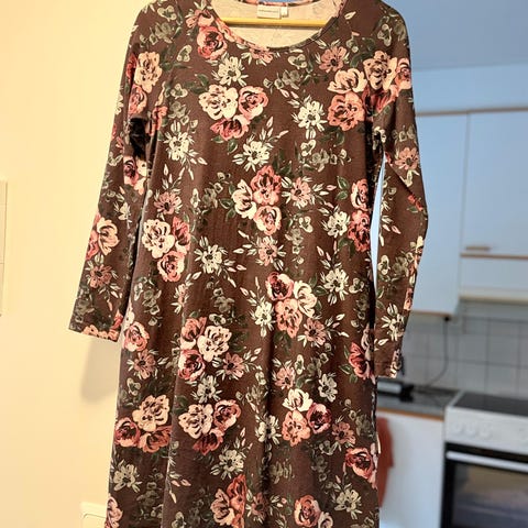 Hyväkuntoinen A-linjainen mekko, jossa helma takaa pidempi. Istuva malli, vastaa kokoaan. Ainoana moitteena kunnossa toisessa kainalossa ompelen löystyminen. Pesty hajusteettomasti, taloudessa ei lemmikkejä.