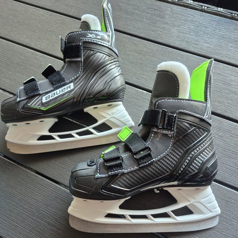 Bauer jääkiekkoluistimet, koko 29,5/Y11 Väri musta-vihreä. Luistimissa tarrakiinnitys kolmella remmillä. Pehmustettu varsi ja sisäosa tuovat tukea ja lämpöä jalalle.