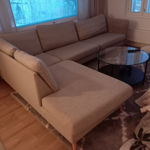 Sohva jossa kangaspäällyste ehjä mutta vähän käytössä elänyt kuten kuvasta näkyy. Helppo levittää vuoteeksi. Tilava vuodevaatelaatikko.