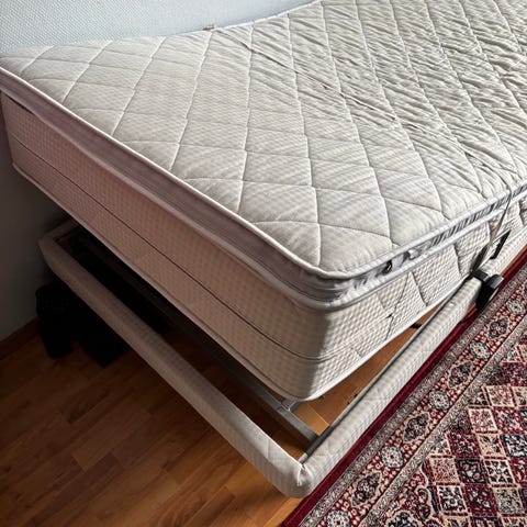 Jyskistä ostettu ikää 3-4v hyvät Tukevat patjat (jousi+vaahtomuovi),petarit .Ollut vanhuksilla parisänkynä.kaksi erillistä sänkyä. kolmessa osassa säätyvä sälepohja sähkömoottorilla. 2 kaukosäädintä .alle puolen hinnan.