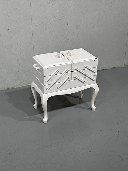 Lattiavalaisin, jossa on vaalea varjostin ja koristeellinen nauha. Valaisimessa on kaksi valopistettä vetokytkimillä ja pyöreä jalusta. Puinen jalka messinkisillä yksityiskohdilla. Valaisin edustaa yksinkertaista ja eleganttia tyyliä, joka sopii monenlaisiin sisustuksiin.
