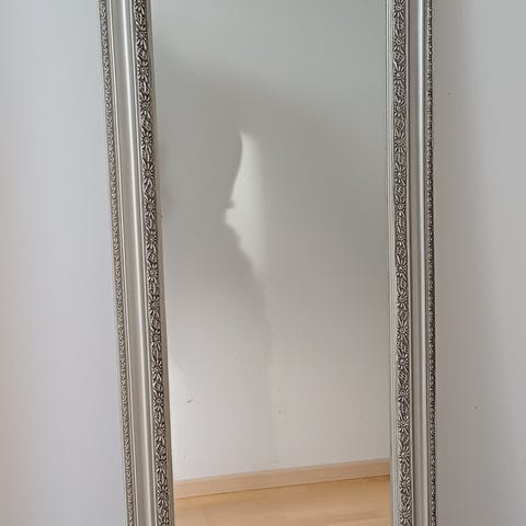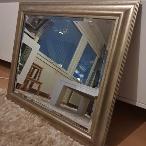 Peili kultakehyksellä. Suurikokoinen, suorakaiteen muotoinen seinäpeili, jossa on kullanvärinen kehys ja takana kiinnikkeet seinälle ripustamista varten. Kehyksissa muutamassa kohtaa pienet jäljet, näkyy kuvissa. Ei pistä silmään käytössä.