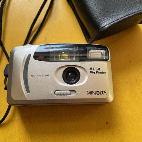Minolta AF35 Big Finder -filmikamera. Kompaktikokoinen 35 mm:n automaattitarkenteinen kamera, jossa suuri etsin helpottaa sommittelua. Kamerassa sisäänrakennettu salama ja rannelenkki. Runko hopeanvärinen etupuolelta ja musta takapuolelta. Mukana Minolta-kantolaukku säilytystä ja kuljetusta varten.