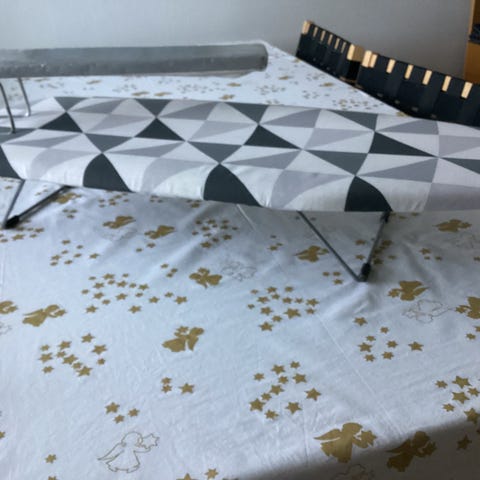 Tukeva ja toimiva, kangas rispaantunut toisesta päästä ja kuuma rauta jättänyt harmaaseen kankaaseen jälkiä, ei haittaa käyttöä