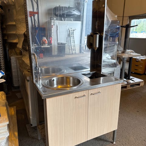 Juoma-asema vesihanalla, jääkaukalolla ja mukipidikkeillä. Juoma-aseman kannessa muutamia reikiä, kuvissa näkyy.