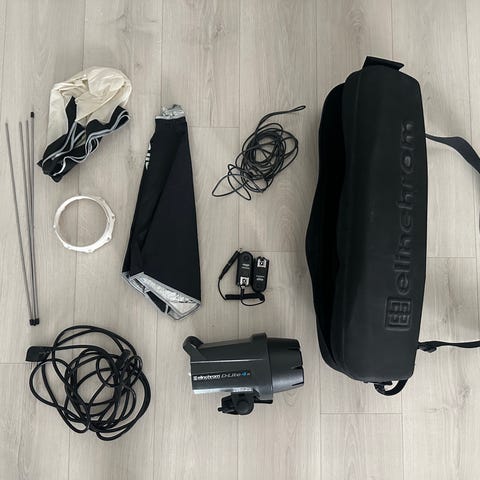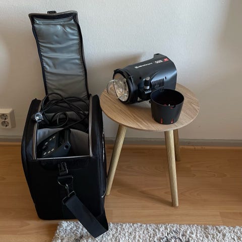 Kaupan pari toimivaa Elinchrom D-Lite2, molemmista studiosalamasta on jalanjuuresta murtunut mutta on korjattu se liimalla. Huom! Myös tässä mallissa vaan kameraan flash sync piuhalla tai orjatilassa. Toki voit laittaa piuhalla kiinni erillisen vastaanottimen salamaan kiinni, joka mahdollistaa erillisen triggerin.