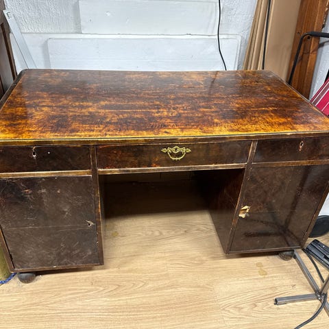 Nätti ja siro kirjoituspöytä, joka vaatii puupintojen korjausta. Sinänsä kaikki kiinnitykset ja mekanismit ovat ehjät eli ihan käyttökelpoinen. Kauniit lankavetimet ja messinkikoristeella mustat metallijalat. Laatikot puuta. Mitat: korkeus 80 cm, leveys 120 cm, syvyys 40 cm.