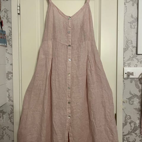 Viimeisessä kuvassa oleva pitkä pellavamekko on myynnissä toisessa kohteessa.