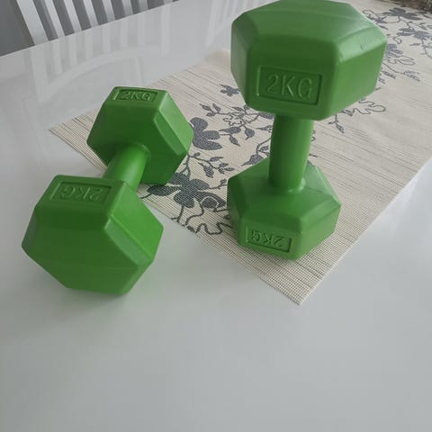Harmaat käsipainot, 3 kg, kotiharjoitteluun. Materiaalina muovi, sisällä todennäköisesti täytepaino. Sopivat esimerkiksi lihaskuntoharjoitteluun, jumppaan ja yleiseen kuntoiluun kotona. Muotoilu helpottaa otetta ja estää painojen pyörimisen lattialla.
