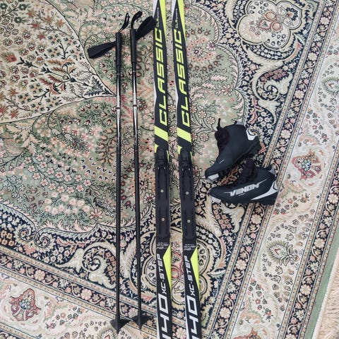 Fischer merkkiset 147 cm sukset,junior sauvat 105 cm ja nnn siteet.Suksissa naarmuja.Nouto Lehmosta.