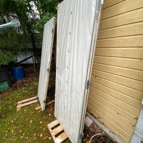 Värilliseksi teipattu ja valkoisia desibeliovia karmeineen ja kahvoineen & lukkoineen päivineen. Teipit kuin uusia.