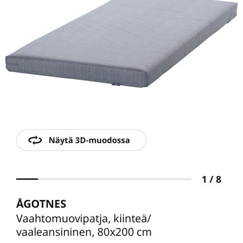 IKEA patja, jossa siniraidallinen päällinen. Sopii yhden hengen sänkyyn tai varapatjaksi. Yhden patjan reunassa on näkyvissä pieni tahra. Soveltuu käytettäväksi esimerkiksi makuuhuoneessa, vierashuoneessa tai mökillä lisävuoteena.