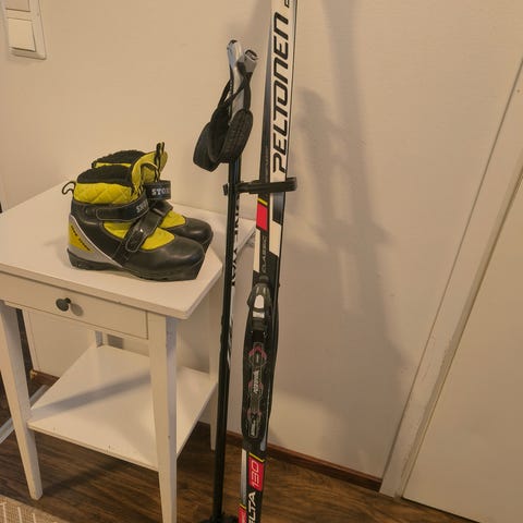 Peltosen perinteisen sukset Sns siteillä. Swix sauvat 105 cm, joissa käden sijat tarrakiristyksellä. Pysyvät käsissä hyvin. Monot ovat 33,5(kuvat).