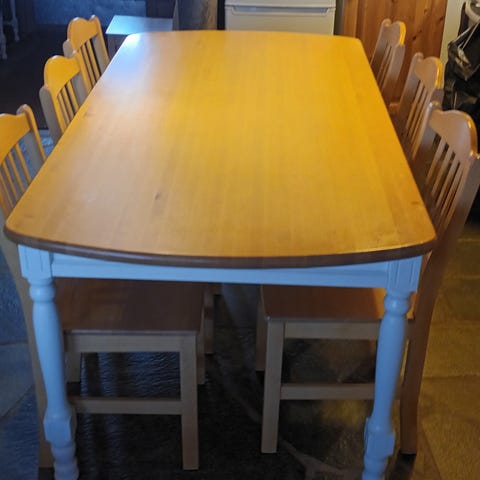 Vuono tuolit 8kpl, nämäkin tukevat koivusta valmistettu. Tuolin mitat; Leveys 43 cm; syvyys 50 cm; korkeus 100 cm; istuinsyvyys 36 cm ja istuinkorkeus 45 cm.